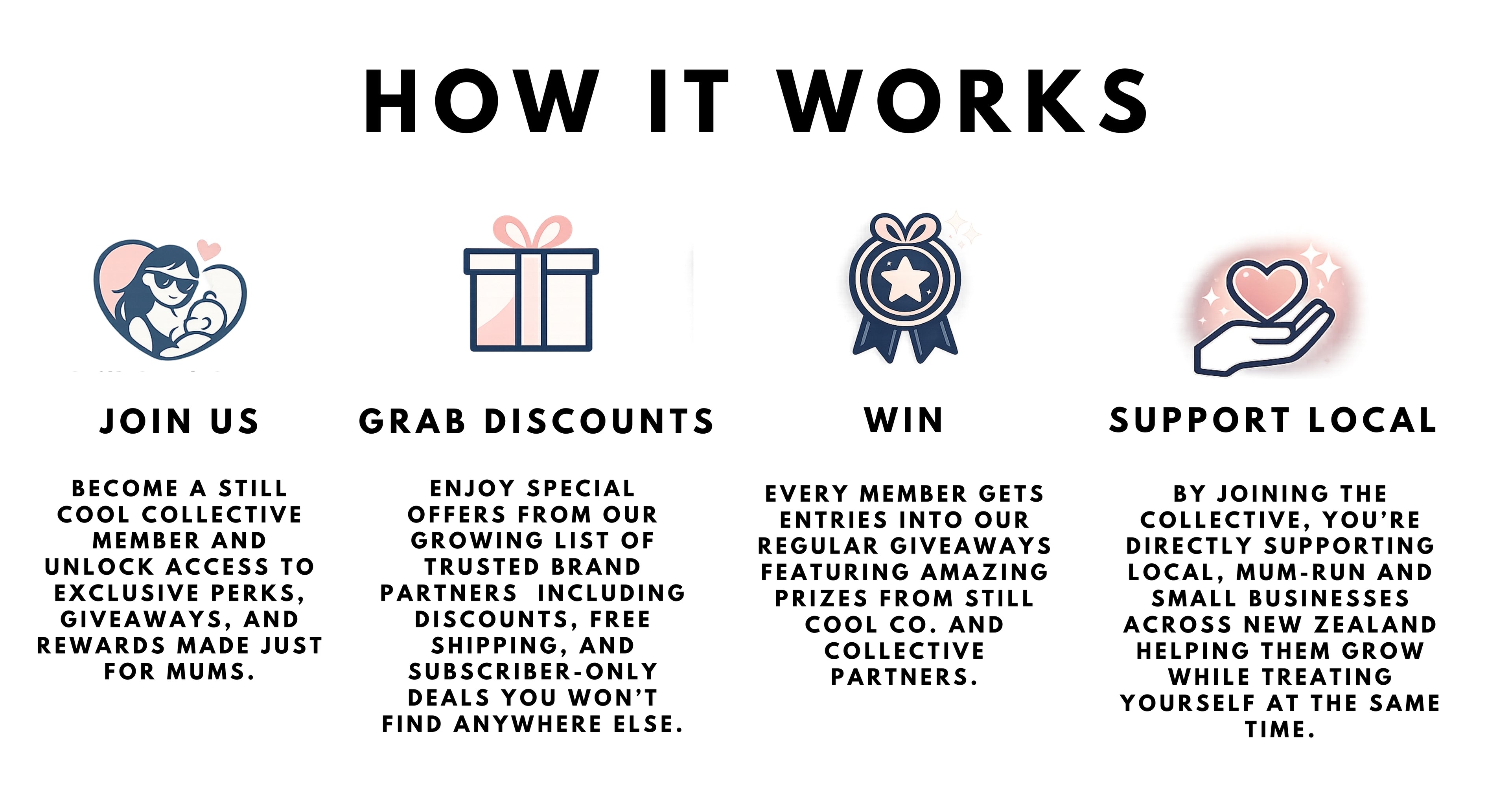 Join the Still Cool Collective and enjoy exclusive discounts from your favourite NZ, mum-run, small businesses, plus 10% off all Still Cool Co products, VIP-only draws, and early access to launches.